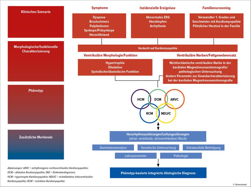 Die Bestimmung des Phänotyps (HCM, DCM, NDLVC, ARVC, RCM) stellt an sich keine Diagnosestellung dar, sondern ist eine Beschreibung der Morphologie aus der kardialen Bildgebung. Die Ätiologie bzw. den Pathomechanismus gilt es für die Diagnosestellung mit weiteren Untersuchungen zu bestimmen. Deshalb sollte der systematische Ansatz nicht bei der Bildgebung enden. Besonders der Genetik wird ein hoher Stellenwert zugeschrieben, diese soll bei allen Patient:innen mit Kardiomyopathie erhoben werden, die hinsichtlich Diagnose, Prognose und Therapie davon profitieren (Klasse-1B-Empfehlung).1