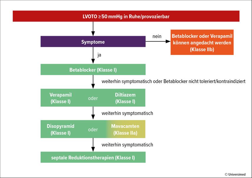 Bei Vorliegen einer relevanten Obstruktion im LVOT (>50mmHg) soll eine medikamentöse Therapie eingeleitet werden (Abb. 2). Therapeutisch wird der Einsatz von Betablocker oder Verapamil/Diltiazem empfohlen. Neuerdings ist Mavacamten, ein reversibler Kardiomyosin-Inhibitor, verfügbar. Diese Therapien können singulär oder auch in Kombination verabreicht werden. Als invasive Therapien stehen die Myektomie oder Alkoholablation zur Verfügung. Der Großteil der asymptomatischen Patient:innen mit LVOTO benötigt keine Therapie.