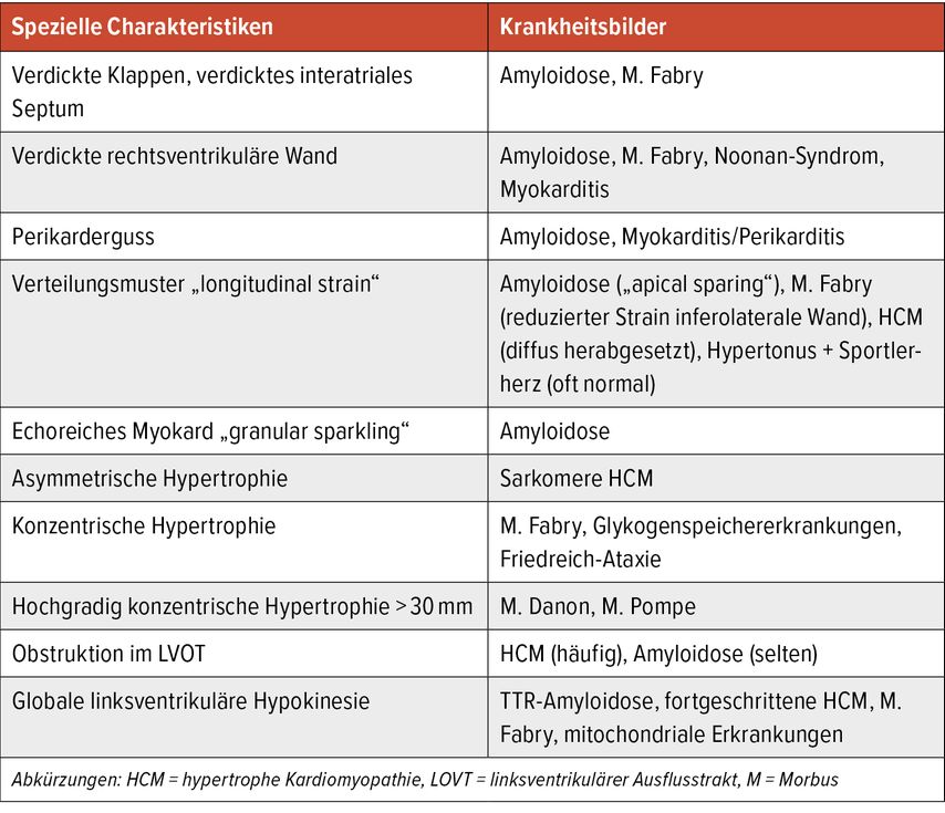 Als erstes und wichtigstes Diagnostikum wird die Echokardiografie angewendet. Es gibt spezielle bildgebende Merkmale, die auf eine bestimmte Ätiologie der HCM hinweisen können, jedoch für sich alleine nicht diagnosesichernd sind (Tab. 1). In der transthorakalen Echokardiografie sollte neben der systolischen und diastolischen Funktion, Klappenbeschreibung, Herzkammergrößen und dem systolischen Pulmonalarteriendruck (sPAP) ein besonderes Augenmerk auf der exakten Messung der maximalen Wanddicke liegen. Diese erfolgt enddiastolisch und Messungen aus verschiedenen Herzachsenansichten sind empfohlen. Typisch bei der HCM ist eine asymmetrische Verteilung der Hypertrophie. Die Messung der linksventrikulären Masse kann aufgrund der isolierten asymmetrischen Verteilung der Hypertrophie bei bis zu 20% normal sein.11