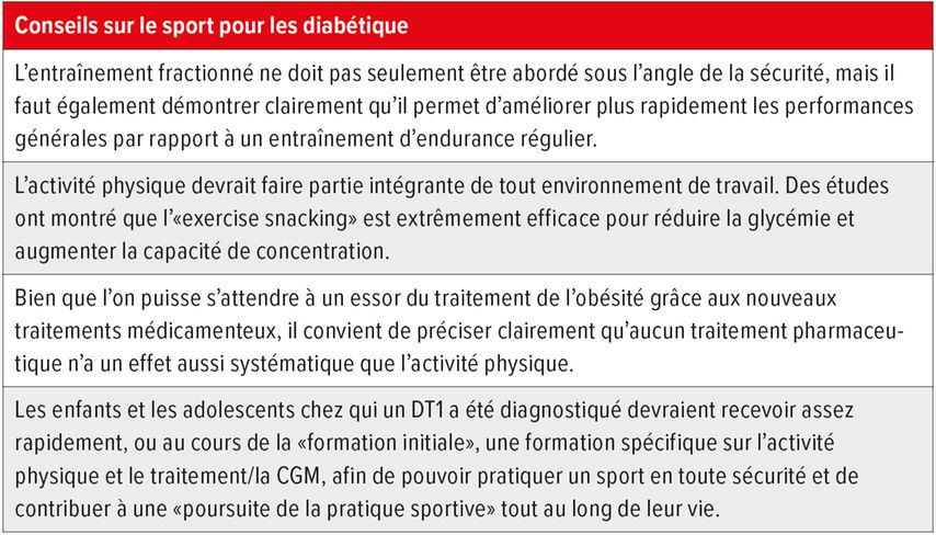 Dans l’étude multicentrique ChilDFiT1 de l’Université de Bayreuth et de l’Université de médecine de Graz, nous avons analysé l’efficacité d’une formation intensive, associée ou non à la pratique de l’athlétisme, chez des adolescents atteints de DT1, en se concentrant sur la glycémie basée sur la mesure continue du glucose (CGM).13 Cette étude a montré que l’association de l’entraînement et de la formation sur une période de quatre semaines améliore significativement le temps passé dans la zone cible (70–180mg/dl) (de 68,9±13,1% à 72,1±10,6%; p=0,049), ce qui n’a pas été constaté dans le groupe suivant seulement la formation (p=0,399). En outre, le taux d’HbA1c s’est amélioré de –0,19% point dans le groupe associant formation et athlétisme (p=0,042) uniquement, ce qui n’a pas été observé dans le groupe suivant seulement la formation (p=0,40). En résumé, l’association athlétisme et formation a un effet positif sur l’équilibre glycémique et le sport devrait être recommandé sans réserve chez les enfants et les adolescents atteints de DT1.