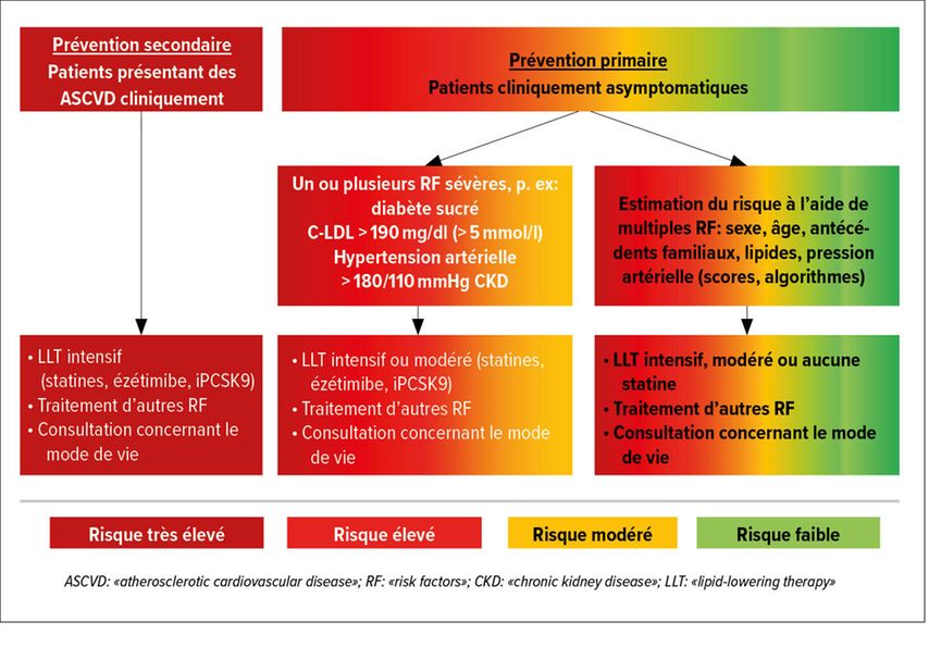 Fig.1: Principes de la stratification du risque cardiovasculaire et de la prise en charge (source: A. von Eckardstein, non publié et avec son aimable autorisation)