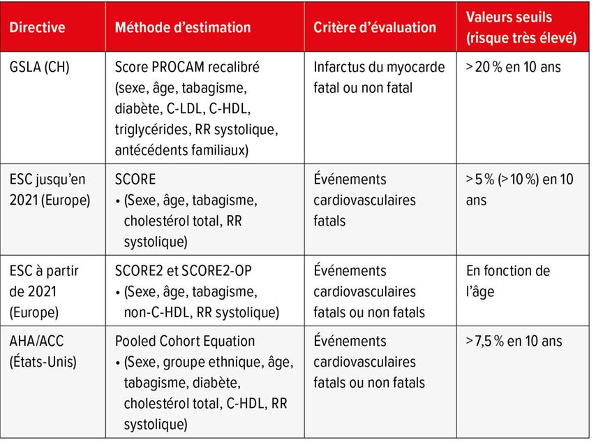 Selon le pays, il existe diverses méthodes d’estimation du risque CV des personnes asymptomatiques, basées sur différents algorithmes: en Suisse, on utilise l’algorithme du GSLA, qui permet d’estimer le risque de survenue d’un infarctus du myocarde fatal ou non fatal dans les dix prochaines années. Ce dernier est considéré comme élevé lorsque la valeur estimée est supérieure à 20% (Tab. 1).
