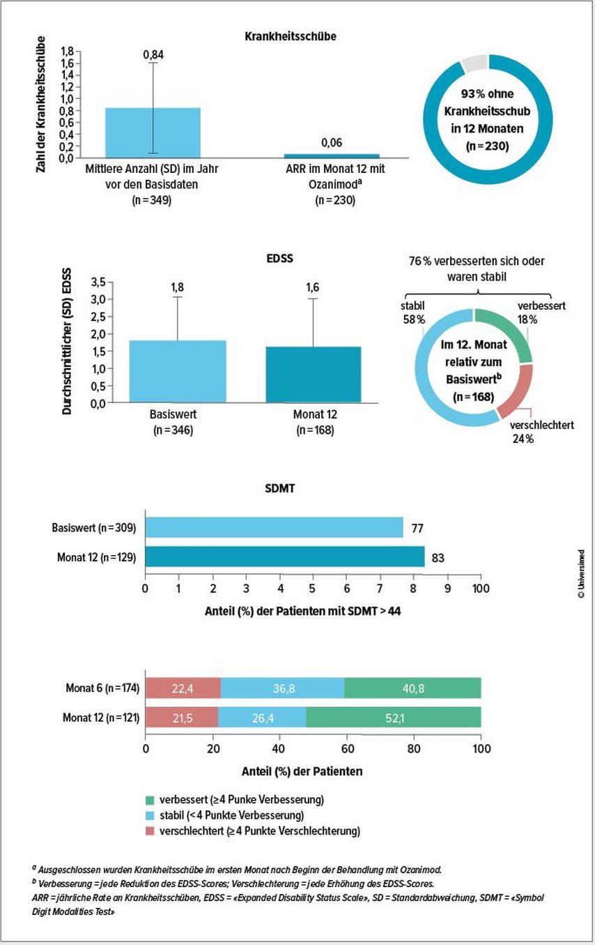 Abb. 1: Während der einjährigen Behandlung mit Zeposia® war die Schubrate niedrig und das Ausmass der Behinderung sowie die kognitive Verarbeitungsgeschwindigkeit blieben überwiegend stabil oder verbesserten sich2