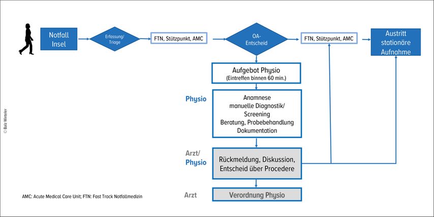 Auch Schweizer Erfahrungen bestätigen diese Entwicklungen. Abbildung 1 zeigt exemplarisch den Prozessablauf der physiotherapeutischen Beurteilung und Behandlung im interprofessionellen Regelbetrieb der Notaufnahme des Inselspitals Bern.
