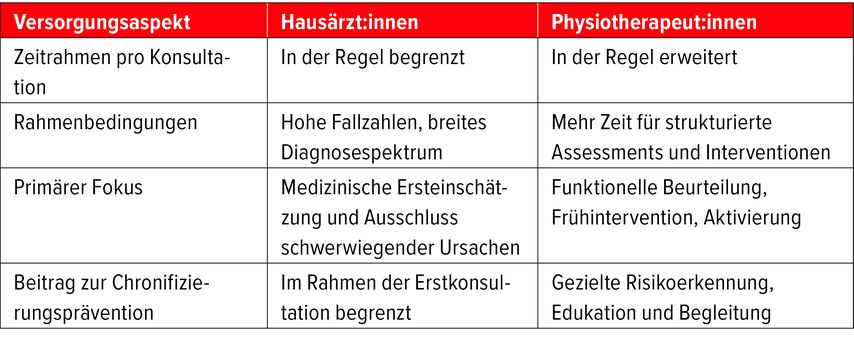 Hausärzt:innen stehen im Alltag vor der Herausforderung, eine Vielzahl komplexer Beschwerden unter hohem Zeitdruck zu beurteilen.7 Physiotherapeut:innen verfügen im Durchschnitt über mehr Zeit pro Konsultation,8 was vertiefte Assessments, gezielte Edukation und aktive Therapieansätze ermöglicht (Tab. 2).