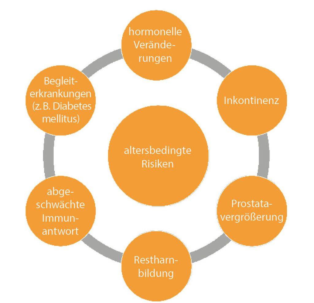 Im Alter verändern sich Schleimhäute, Blasenfunktion und Immunabwehr. Die Harnblasenmuskulatur wird weniger elastisch (Compliance) und die Restharnmenge kann steigen, was das Risiko für Infektionen erhöht. Zudem sind häufig Begleiterkrankungen wie Diabetes mellitus, Prostatavergrößerung oder Inkontinenz vorhanden, die die Infektanfälligkeit erhöhen. Als Infekttrigger sind besonders Glukosurie-fördernde Medikamente wie Empaglifozin und Dapaglifozin zu erwähnen. Die Symptome sind häufig anders als bei jungen Patienten. So können eine neu aufgetretene Inkontinenz, eine Verschlechterung des Allgemeinzustandes mit Fieber und Erbrechen oder auch das Auftreten eines akuten Harnverhaltes auf eine Harnwegsinfektion hindeuten. Abbildung 1 zeigt die wichtigsten altersbedingten Risikofaktoren.
