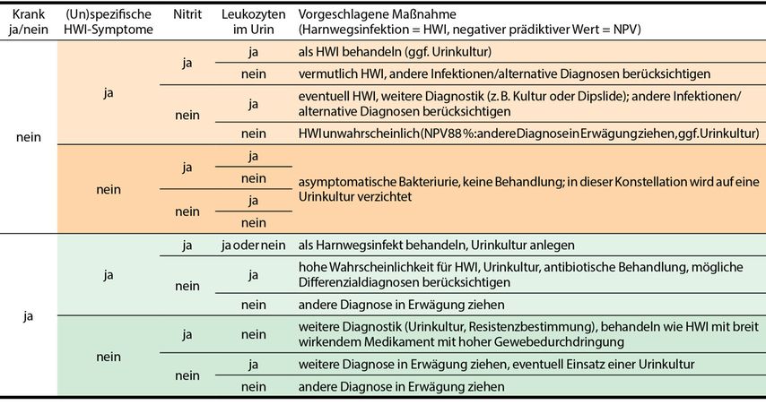 Tab. 1: Gestuftes Vorgehen bei Verdacht auf Harnwegsinfekt (HWI) bei geriatrischen Patienten (ohne Katheter) gemäß aktueller S3-Leitlinie Harnwegsinfektion