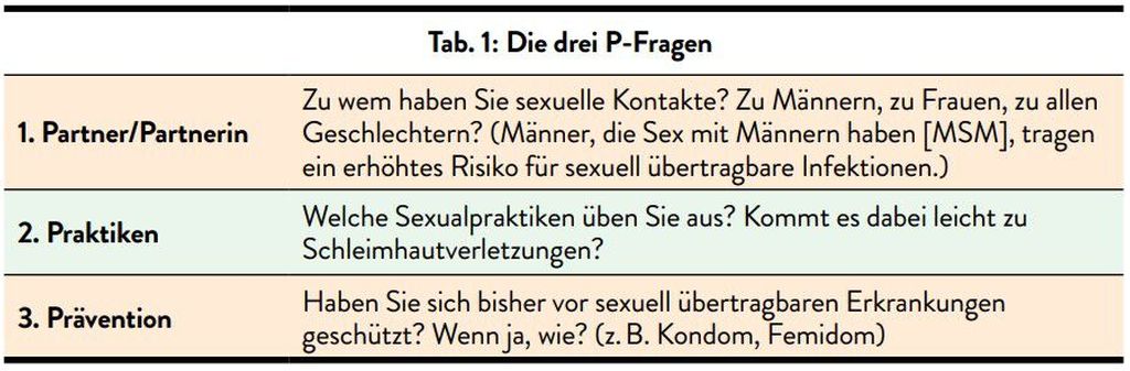 Um einen Beratungsbedarf abschätzen zu können, ist es wichtig, eine Sexualanamnese durchzuführen. Bei der Erhebung können uns die drei sogenannten P-Fragen eine Hilfestellung geben, um besser einschätzen zu können, ob eine HIV-PrEP infrage kommt (Tab.1). Dabei sollte vorab erläutert werden, warum diese Fragen gestellt werden. Beispielformulierungen dazu sind: