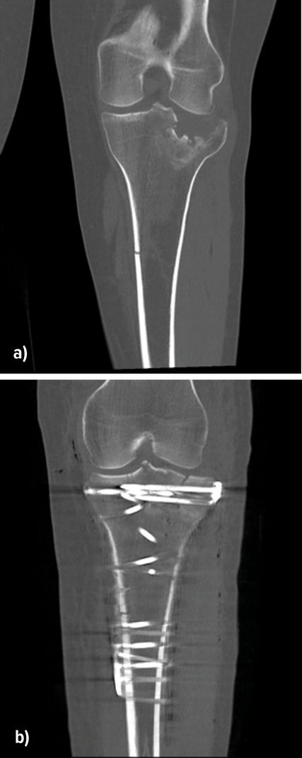 Abb. 5: Versorgung einer lateralen Impression. (a) Präoperativ. (b) Postoperativ