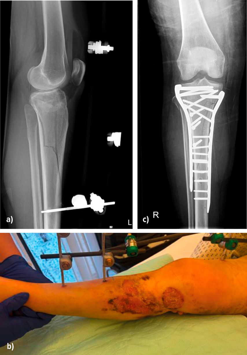 Bei stark geschwollenen Weichteilen ist ein zweizeitiges Vorgehen mit primärer Anlage eines gelenkübergreifenden Fixateur externe für 5–10 Tage erforderlich, um die Weichteile zur Ruhe kommen zu lassen und das Risiko für Wundheilungsstörungen zu senken (Abb.4).
