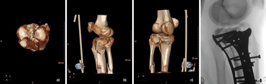 Abb. 3: Präoperative CT-basierte Planung mittels 3D-Rekonstruktion des Kniegelenkes bei angelegtem Fixateur externe (a–c) und anschließende Versorgung mit medialer, lateraler und posteriorer Platte (d)