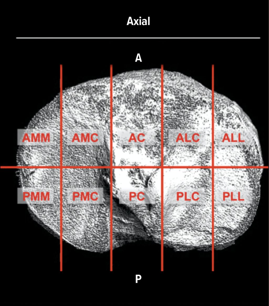 Die „Zehnsegmentklassifikation“ nach Frosch und Krause unterteilt das Tibiaplateau in 4 Quadranten und 10 Segmente. Dieses Modell ist behandlungsorientiert: Jedes Segment ist einem oder mehreren spezifischen chirurgischen Zugangswegen zugeordnet. In einer retrospektiven Analyse konnte nachgewiesen werden, dass die Versorgungsrealität in 74,33% der Fälle mit den Empfehlungen dieses Modells übereinstimmt, was dessen hohe klinische Relevanz unterstreicht (Abb. 2).
