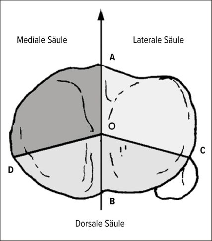 Alternativ teilt das Modell nach Luo et al. den Tibiakopf in eine mediale, laterale und posteriore Säule ein. Es hilft insbesondere bei der Entscheidung, ob ein dorsaler Zugang notwendig ist, um posteriore Abscherfragmente stabil abzustützen (Abb. 1).
