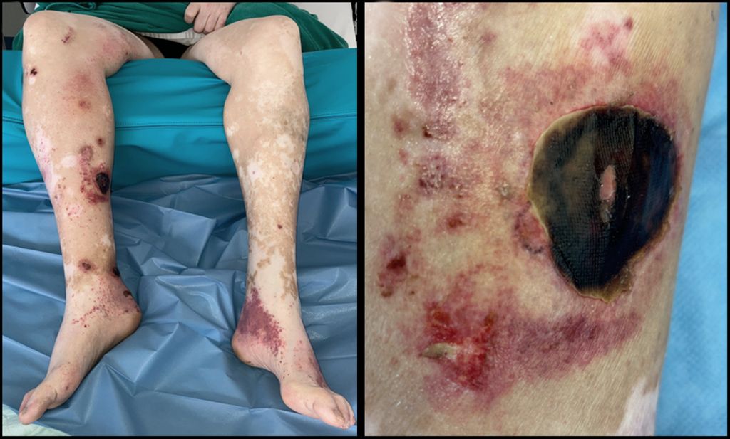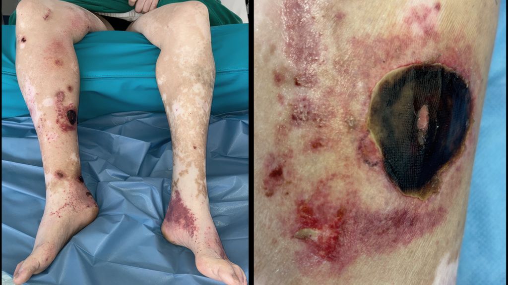Die Patientin im Alter von 70 Jahren gibt bei der Erstvorstellung einen verschleppten Infekt an, der seit rund vier Wochen besteht und zunächst mit Abgeschlagenheit, Rhinitis, Halsschmerzen und intermittierendem Schüttelfrost einhergeht. Dann treten plötzlich Wunden auf, die mit schwarzen Krusten belegt sind. Diese hämorrhagischen Läsionen mit Nekroseplatte sind bei der Inspektion auf beiden Unterschenkeln festzustellen (Abb.1).