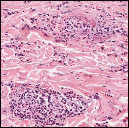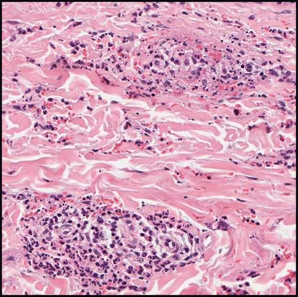 Auch die histopathologische Diagnose ist nicht immer eindeutig: Klassischerweise finden sich von Neutrophilen umringte Gefässe, fibrinoidverquollene Gefässwände mit teilweise auftretenden Gefässokklusionen, Erythrozytenextravasate sowie eine ausgeprägte Leukozytoklasie mit den typischen «Kernstaub»-Fragmenten aufgrund des Zerfalls von Neutrophilenkernen (Abb. 2). Diese Merkmale sind zwar in der Regel pathognomonisch, doch die Diagnosestellung wird dadurch erschwert, dass sich die Abnormitäten erst im Laufe der Zeit manifestieren können (vor der Entwicklung der voll ausgeprägten LCV-Veränderungen sind etwa nur fokale Schäden an Kapillargefässen zu sehen).1