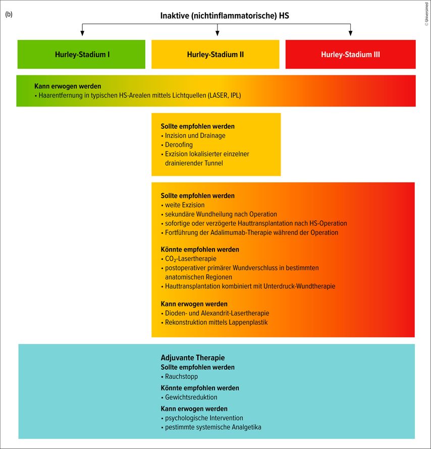 In der Behandlung der HS steht die frühzeitigeTherapie entzündlicher Läsionen im Fokus, um irreversible Gewebedestruktion mit Fistel- und Narbenbildung zu verhindern oder zu verlangsamen.