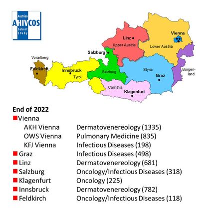 Abb. 1: HIV-Behandlungszentren in Österreich, ohne niedergelassenen Bereich (in Klammer: Anzahl der betreuten HIV-Infizierten Ende 2022)