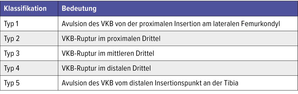 Die erste bekannte Studie zum Thema der VKB-Refixation stammt aus dem Jahr 1976. Darin wurden relativ hohe Rerupturraten von 50% nach 5 Jahren beschrieben. Interessanterweise konnte jedoch auch gezeigt werden, dass jene, die nach 5 Jahren keine Reruptur erlitten hatten, auch 30 Jahre postoperativ noch gute Ergebnisse aufwiesen.4 Im Jahr 1991 hingegen erläuterten Sherman et al., dass Patient:innen mit proximaler Avulsion des VKB sowie jene mit guter Qualität des VKB-Stumpfes signifikant bessere Ergebnisse nach VKB-Refixation aufwiesen. Infolge dieser Publikation entstand die bis heutig gültige Sherman-Klassifikation für VKB-Rupturen (Tab.1).5 In den darauffolgenden Jahrzehnten wurden Konzepte mit Modifikationen der VKB-Refixation zur Reduktion der Rerupturrate veröffentlicht, beispielsweise das Konzept der „healing response“ durch Mikrofrakturierung am femoralen Footprint.