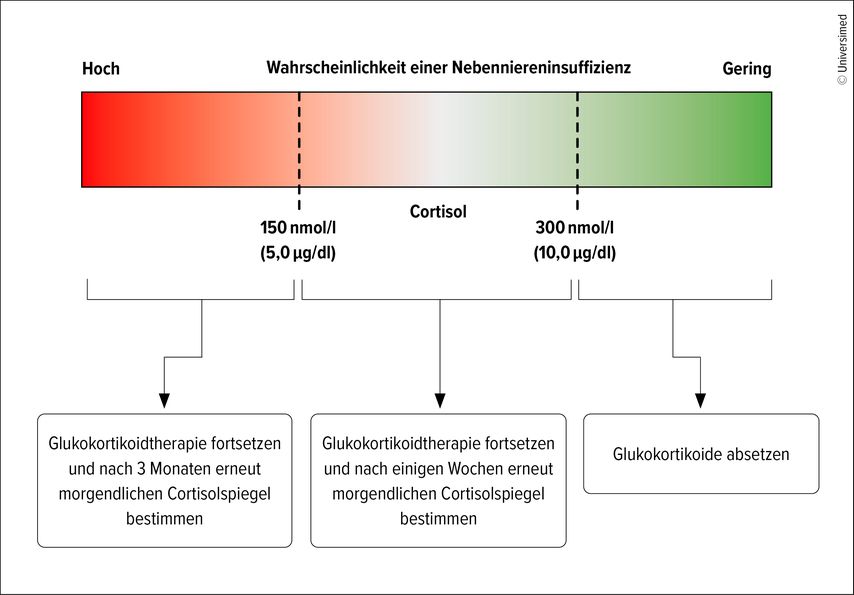 Es gebe zwei Möglichkeiten: Die erste bestehe darin, die Glukokortikoiddosis unter klinischer Überwachung auf Anzeichen und Symptome einer NNI schrittweise zu reduzieren. Die andere Option sei, den morgendlichen Cortisolspiegel zu bestimmen, um die Erholung der HPA-Achse quantitativ zu erfassen. Der Cortisolwert solle dabei als Kontinuum betrachtet werden: Liege er unter 150nmol/l, sei die Wahrscheinlichkeit einer NNI hoch, während bei Werten von 300nmol/l oder mehr das Risiko sehr gering sei (Abb.2). In diesem Fall könne man die Glukokortikoide weiter ausschleichen oder ganz absetzen, sagte Beuschlein.