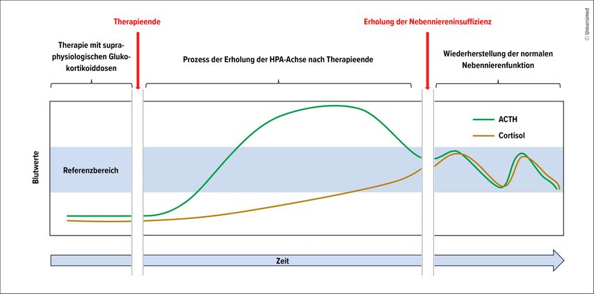 Abb. 1: Schematische Darstellung der Erholung der HPA-Achse nach Absetzen einer supraphysiologischen Glukokortikoidtherapie (modifiziert nach Beuschlein F et al. 2024)1
