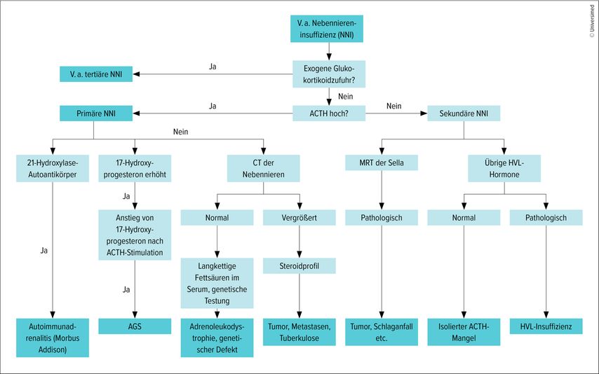 Im Rahmen der Anamnese sollten bei Verdacht auf Nebenniereninsuffizienz exogene Glukokortikoide sowie Opiate sorgfältig erfasst werden. Hierzu gehört auch die Anwendung topischer Applikationsformen wie beispielsweise Cortison-haltiger Nasen- und Asthmasprays sowie intraartikulärer Injektionen. Die laborchemische Basisdiagnostik umfasst die Bestimmung von Elektrolyten, Nierenfunktion, Blutbild und Entzündungswerten. Laborchemisch geht eine Nebenniereninsuffizienz in >80% der Fälle mit einer Hyponatriämie einher.15 Bei unklarer Hyponatriämie sollte daher differenzialdiagnostisch auch immer an eine Nebenniereninsuffizienz gedacht werden. Zusätzlich sollte eine basale (nüchtern morgens) Bestimmung von Cortisol und ACTH im Serum erfolgen und ein ACTH-Stimulationstest durchgeführt werden. Nach der basalen Blutentnahme wird hierbei 250µg ACTH (Synacthen®) i.v. verabreicht und Cortisol nach 30 und 60 Minuten bestimmt. Die genauen Referenzwerte des Tests hängen dabei von dem verwendeten Assay sowie der Einheit ab. Generell wird eine Cortisolkonzentration von mindestens 500nmol/l (entspricht 18µg/dl) für Immunoassays und mindestens 412nmol/l (entspricht15µg/dl nach 30 Minuten) bzw. 485nmol/l (entspricht 17,6µg/dl, nach 60 Minuten) für massenspektrometrisch Messungen („liquid chromatography-mass spectrometry“; LCMS)empfohlen.16 Sobald eine Nebenniereninsuffizienz nachgewiesen wurde, muss eine Ursachensuche ergänzt und differenzialdiagnostisch abgewogen werden (Abb.1). Zudem müssen Betroffene im Umgang mit der täglichen Substitution geschult sowie auch insbesondere im Vorgehen bei Notfallsituationen angeleitet werden.