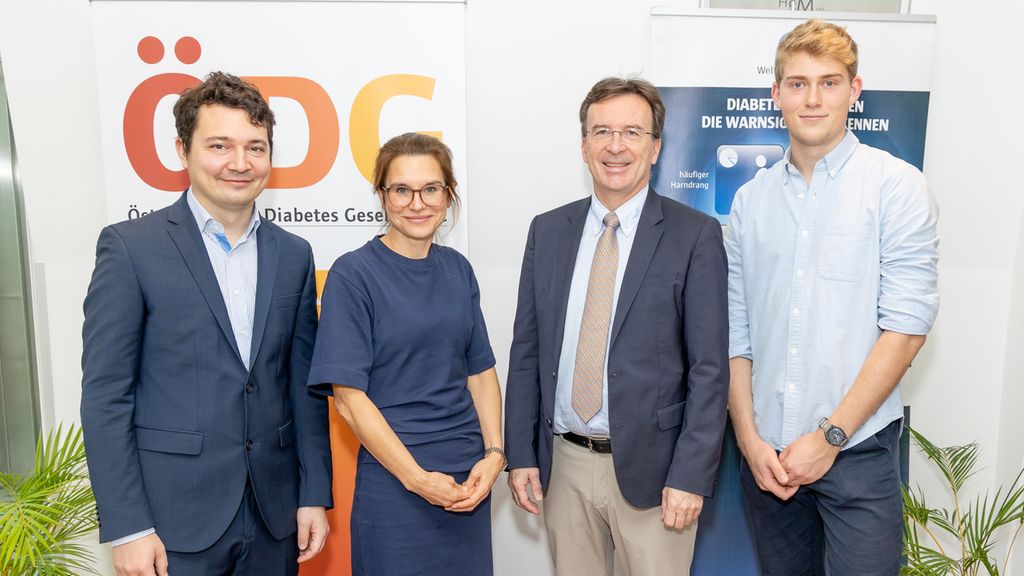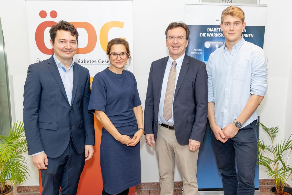 Abb. 1: Die Österreichische Diabetes Gesellschaft am Weltdiabetestag (von links nach rechts: OA Dr. Michael Resl, Univ. Priv-Doz. Dr. Maria Fritsch,Prim. Univ.-Prof. Dr. Martin Clodi, Thomas Führer)