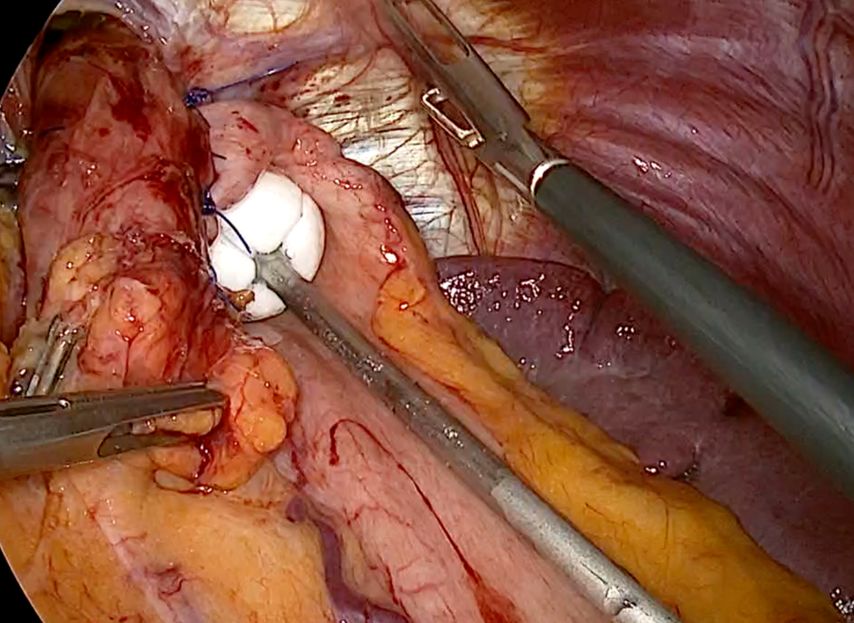 Abb. 2: Einbringen eines neuartigen Implantats (RefluxStop) zur Stabilisierung des Situs nach Intraabdominalisierung und Hiatoplastik so wie His-Winkel-Rekonstruktion