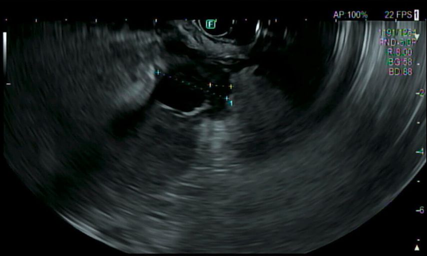 4 Tage nach Entfernung der Pigtail-Drainage präsentiert sich die Patientin mit zunehmenden Schmerzen und steigenden Entzündungsparametern. Trotz der regelmäßigen Spülungen und Keimspektrum-gerechten antibiotischen Therapie tritt ein Abszessrezidiv auf. Eine neuerliche perkutane Pigtail-Drainage wird gelegt, diesmal CT-gezielt. Bei der Kontrastmittelapplikation über die neue Pigtail-Drainage unmittelbar nach der Intervention kann keine Verbindung zum Magenlumen oder zur freien Bauchhöhle dargestellt werden. Es wird daher geplant, den Abszessinhalt endosonografisch gezielt in den Magen abzuleiten.