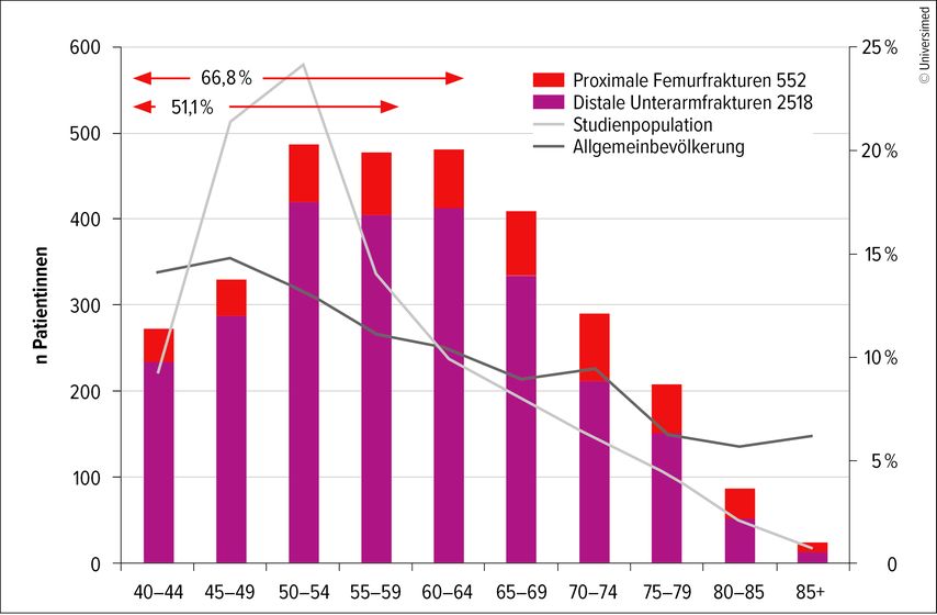 Die Häufigkeit von Fragilitätsfrakturen variiert je nach Alter und Lokalisation: Distale Unterarmfrakturen (Radius- oder Handgelenksfrakturen) treten meist schon in der frühen Postmenopause (PMP) – vor dem 65. Lebensjahr – auf, während die Zahl der Wirbelkörper- und proximalen Oberschenkelfrakturen (Hüftfrakturen) in der späten PMP, mit dem Alter zunehmend, ansteigt.9