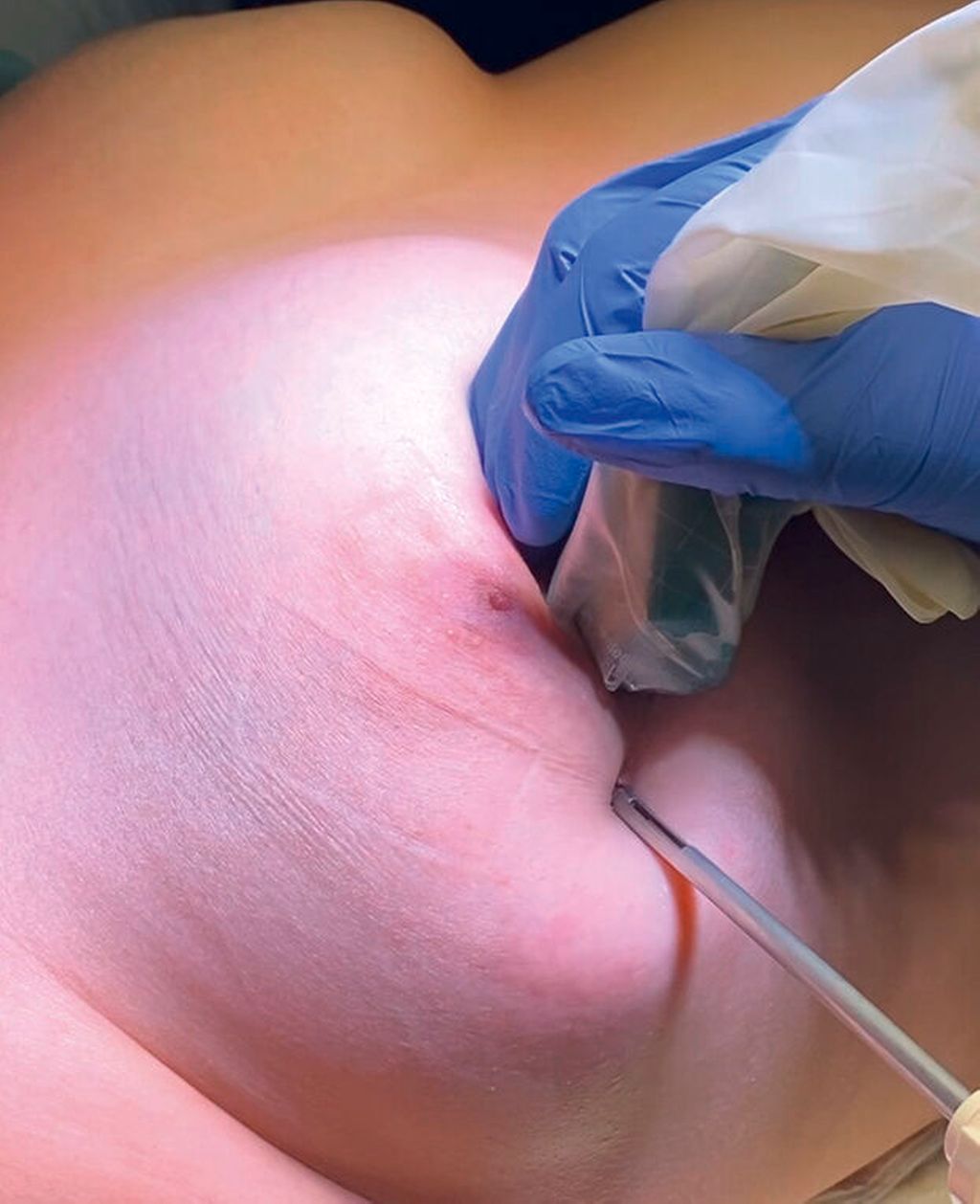 Nach Stichinzision der Haut wird die VAB-Nadel unter ständiger sonografischer Sichtbarkeit dorsal des Zielbefundes positioniert (Abb. 3). Die Richtung der Nadelöffnung entspricht zumeist der Bedienleiste auf dem Handstück des VAB-Gerätes und wird üblicherweise zwischen 45° und 180° Winkelöffnung eingestellt. Die Entfernung der Zielläsion durch schichtweise Schnitte der VAB-Nadel wird unter ständiger US-Kontrolle durchgeführt und die Gewebszylinder werden in einer angeschlossenen Kammer gesammelt. Sollte bei dem Vorgehen eine Blutung einen sonografischen Artefakt verursachen, kann diese durch die Vakuumfunktion der Nadel entfernt werden. Nach der Intervention kann eine Clipeinlage zur Markierung der Biopsiestelle sinnvoll sein. Zur Blutstillung wird eine lokale Kompression durchgeführt und ein Kompressionsverband angelegt. Die Einstichstelle wird durch ein adaptierendes Pflaster versorgt.