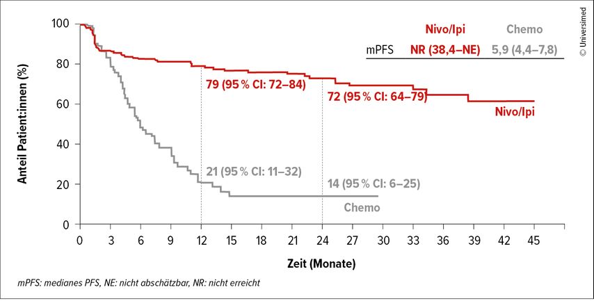 Abb. 1: PFS von Patient:innen mit zentral bestätigtem metastasiertem MSI-H- oder dMMR-Kolorektalkarzinom (modifiziert nach Andre T et al.)1