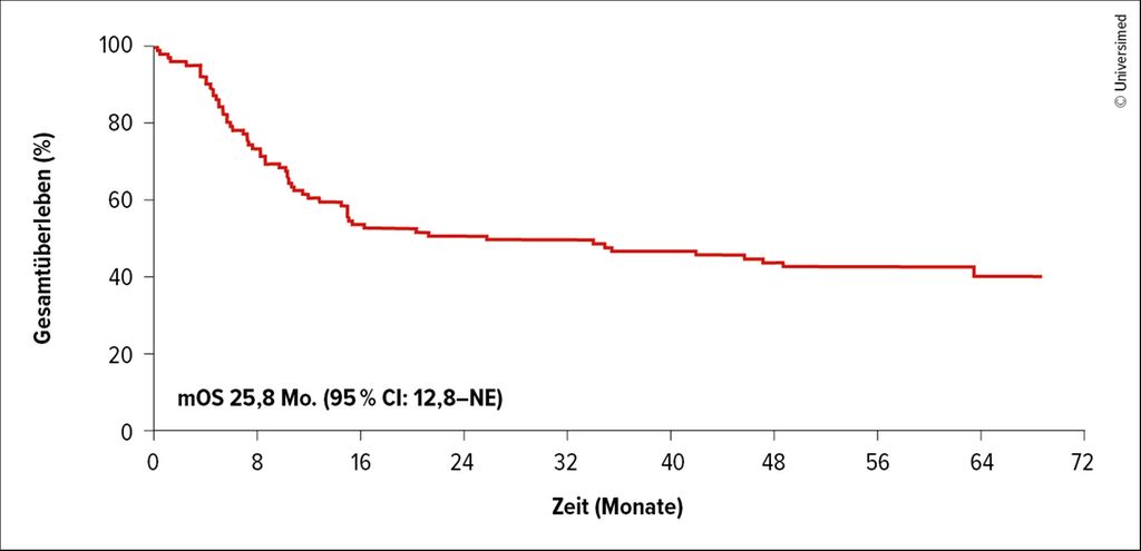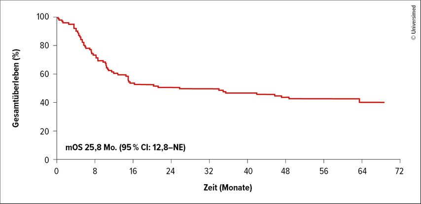 Derzeit werden CAR-T-Zellen vor allem bei hämatologischen Tumoren eingesetzt und erzielen dort hohe Gesamt- und Langzeitüberlebensraten. Zum Beispiel wurden die Ergebnisse der ZUMA-1-Studie mit Axicabtagen ciloleucel (Axi-cel) mit jenen der SCHOLAR-1-Studie (Chemotherapie) bei refraktärem großzelligem B-Zell-Lymphom verglichen.8 Das mediane Gesamtüberleben (mOS) lag in ZUMA-1 bei 31 Monaten und in SCHOLAR-1 bei 5,4 Monaten mit OS-Raten von 54% (ZUMA-1) und 20% (SCHOLAR-1). Inzwischen sind auch die 5-Jahres-Daten veröffentlicht. Die OS-Rate der Axi-cel-Gruppe betrug rund 43% (Abb.2), bei Patient:innen, die unter der Therapie eine Komplettremission (CR) erreicht hatten, lag die 5-Jahres-OS-Rate bei 64%.9