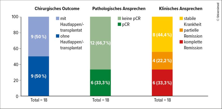 Schließlich zeigte der Referent noch Daten zu Talimogen laherparepvec (T-VEC), einem onkolytischen Virus, das direkt in die Metastasen injiziert wird und zu einer höheren lokalen Ansprechrate führt. Diese Therapie wurde in einer Studie unter Führung der Universitätsklinik für Dermatologie bei Patient:innen mit kutanen Basalzellkarzinomen eingesetzt. Die Tumoren waren zwar operabel, doch die Wiederherstellung hätte größere Eingriffe, etwa eine Lappenplastik, erfordert. Nach sechs Zyklen T-VEC konnte in 50% der Fälle der Tumor so verkleinert werden, dass nach der Operation ein einfacher Wundverschluss ausreichte. Ein Drittel der Patient:innen zeigte im OP-Präparat eine pCR und bei allen war der Tumor zumindest geschrumpft (Abb. 3).24 Hinsichtlich der translationalen Forschung habe diese Studie gezeigt, dass das Immunsystem „umprogrammiert“ werden kann, schloss Höller.