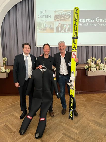 Olympiasieger und Weltmeister Bernhard Gruber, ehemaliger österreichischer Nordischer Kombinierer, gab eine Keynote Lecture zu seinem beeindruckenden Werdegang (v. li. n. re.: Maximilian Kasparek, Bernhard Gruber, Thomas Müllner)