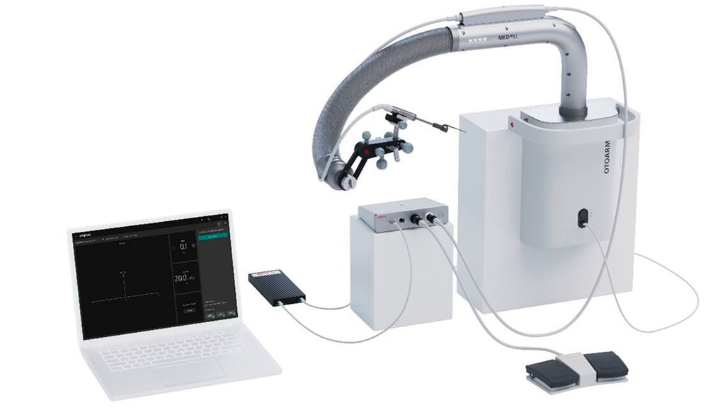 Abb. 1: OTODRIVE und OTOARM – das komplette System für die unterstützte elektromotorische Insertion des Cochlea-Implantat-Elektrodenarrays