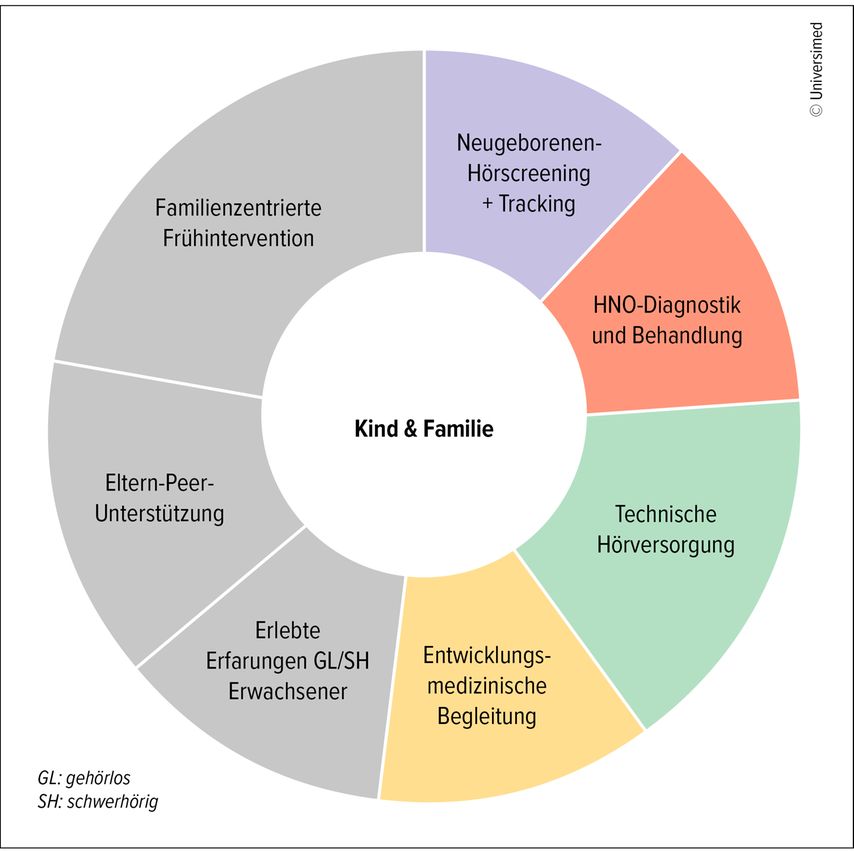 Effektive moderne Frühintervention bedeutet das interdisziplinäre koordinierte Zusammenwirken von Screening und Tracking, HNO-Diagnostik und hörtechnischer Versorgung, enwicklungsmedizinischer Begleitung und familienzentrierter Frühintervention.