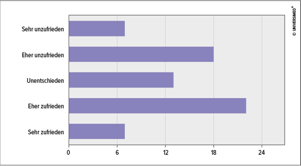 Weiters hatten 67,3% der Befragten Bedenken, dass sie die vorgeschriebenen Ausbildungsinhalte bis zum Ende der Ausbildungszeit überhaupt erlernen können. Es zeigte sich ein Zusammenhang zwischen strukturierter Ausbildung und Zufriedenheit, jedoch keine statistisch signifikante Korrelation: In der Gruppe der eher unzufriedenen Personen gab es für die Mehrheit keine grobe Ausbildungsstruktur und unter den sehr Unzufriedenen für niemanden.