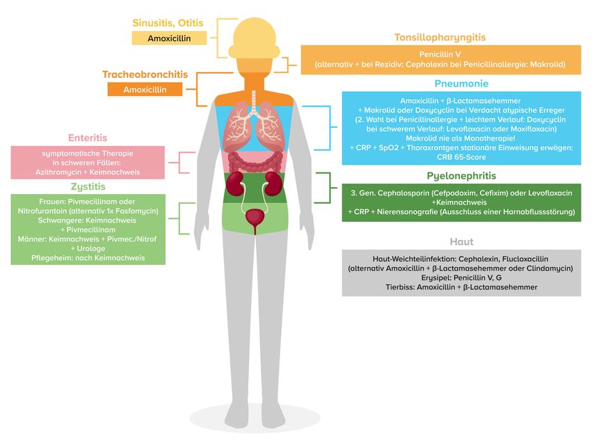 Bei Tonsillopharyngitis das gegen grampositive Streptokokken wirksame Schmalspektrum-Penicillin V einsetzen. Bei allen anderen Infektionen ist das auch gegen gramnegative Keime wirksame Aminopenicillin/Amoxicillin zu empfehlen.