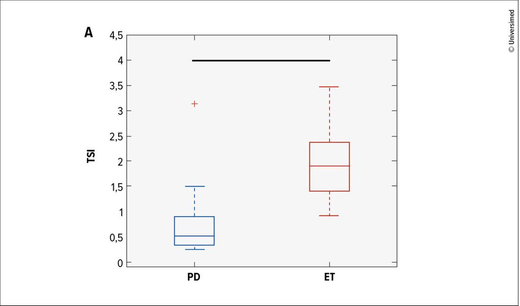 Abb. 2: Box-Plot der Verteilung im Tremorstabilitätsindex (TSI) zeigt eindeutige Unterschiede zwischen Parkinsontremor und essenziellem Tremor (modifiziert nach di Biase L et al.)31