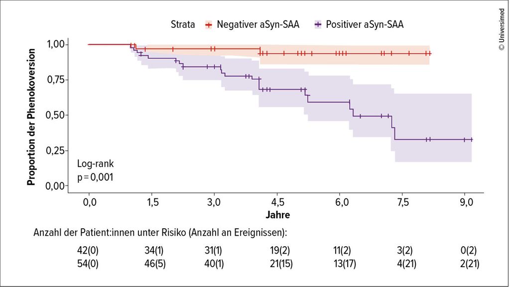 Als biologischer Marker kommt unter anderem der Nachweis von α-Synuklein mit sogenannten Seed-Amplification-Assays (SAAs) aus Liquor- oder Plasmaproben infrage. So untersuchten Siderowf et al. α-Synuklein-SAAs von 51 Personen im prodromalen Stadium mit Hyposmie und REM-Schlaf-Verhaltensstörungen und von 310 asymptomatischen Träger:innen der Risikogene für die „leucine rich repeat kinase 2“(LRRK2) oder die Glucocerobrosidase (GBA). In der Studie wiesen 86% der prodromalen PD-Risikopatient:innen einen positiven α-Synuklein-SAA-Befund auf, während dies nur bei 8% der Genträger:innen der Fall war, bei denen sich die Erkrankung nicht manifestierte.5 Eine weitere Studie bei 96 Menschen im prodromalen Stadium belegte eine signifikant höhere Phänokonversion zu PD bei α-Synuklein-Positivität im Vergleich zu Teilnehmenden mit einem negativen Befund (p=0,001; Abb. 1).6