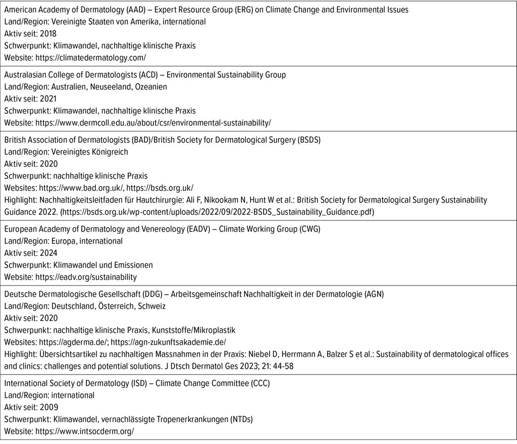 In den letzten Jahren haben sich Initiativen für ressourceneffiziente Dermatologie innerhalb nationaler und internationaler Fachgesellschaften aufgestellt; diese arbeiten aktiv an Klimaschutz- und Anpassungsstrategien.
