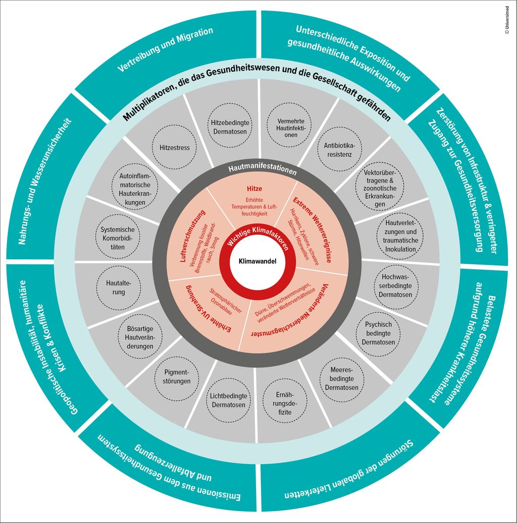 Abb. 1: Zusammenhänge zwischen Klimawandel und Dermatologie (modifiziert nach Parker ER et al. 2025)12