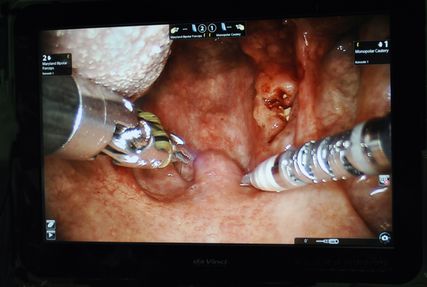 Das mit TORS üblicherweise angewandte chirurgische Verfahren ist die En-bloc-Resektion. Die großflächige Freilegung durch große Mundretraktoren und flexible Kameras ermöglicht eine hervorragende Sichtbarkeit selbst distaler Tumoren der Zungenbasis. Und im Gegensatz zur Arbeit mit einem Laryngoskop bei der TLS beeinträchtigen größere En-bloc-Resektionen und große exophytische Tumorteile die Sicht des Chirurgen weniger.