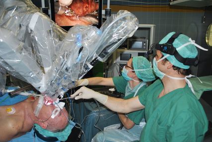 Abb. 3: Ein Team aus einem Chirurgen und einem „bedside assistant“ arbeitet während der TORS am Patienten