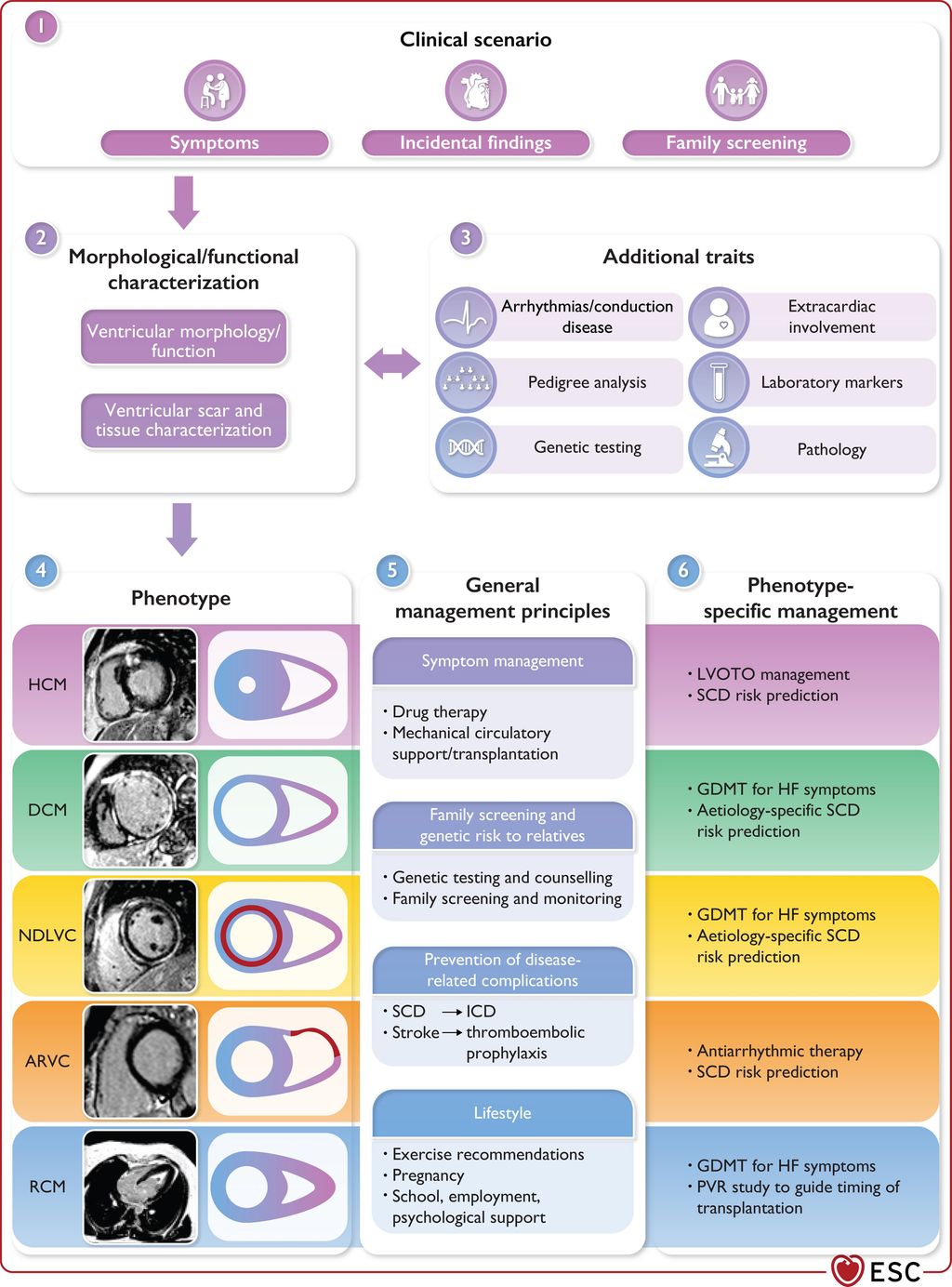 Abb. 1: Key aspects in the evaluation and management of cardiomyopathies. ARVC, arrhythmogenic right ventricular cardiomyopathy; CMR, cardiac magnetic resonance; DCM, dilated cardiomyopathy; GDMT, guideline-directed medical therapy; HCM, hypertrophic cardiomyopathy; HF, heart failure ICD, implantable cardioverter defibrillator; LVOTO, left ventricular outflow tract obstruction; MCS, mechanical circulatory support; NDLVC, non-dilated left ventricular cardiomyopathy; PVR, pulmonary vascular resistance; RCM, restrictive cardiomyopathy; SCD, sudden cardiac death (aus Arbelo E et al. 2023)4