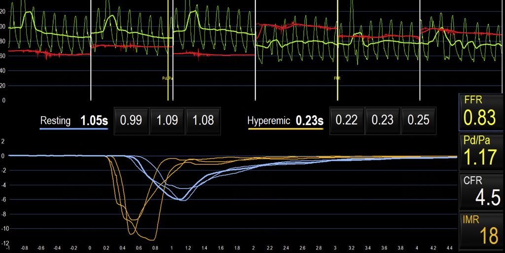 Mithilfe der gleichzeitig durchgeführten Bestimmung der mikrovaskulären Funktion mittels Thermodilution kann bei einem IMR von 18 (und einer CFR von 4,5) eine Mikrozirkulationsstörung und somit eine kardiale Ursache der geschilderten Beschwerden weitgehend ausgeschlossen werden (Abb. 1).
