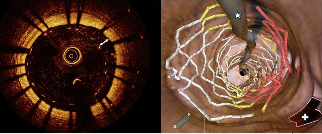 Abb. 2: Optische Kohärenztomografie im Querschnitt (links) und simultane 3D-Rekonstruktion (rechts) mit Stentmalapposition (links: Doppelpfeil; rechts: vom System rot eingefärbt) am proximalen Stentende. Stern: Koronardraht; Kreuz: Abgang eines Seitenastes