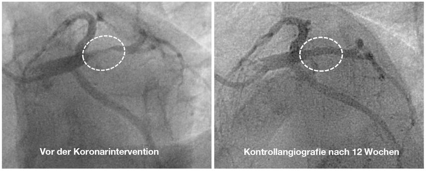 In der Koronarangiografie zeigt sich bei einem 29-jährigen Patienten mit einer positiven Familienanamnese für eine frühe koronare Herzkrankheit und typischer Angina pectoris eine höchstgradige Stenose im grossen Ramus intermedius (Abb. 3, links). Bei diesem jungen Patienten erfolgt die Behandlung mit einem medikamentenbeschichteten Ballon. Die Kontrollangiografie, die aufgrund atypischer Beschwerden durchgeführt wird, zeigt nach 3 Monaten ein gutes Ergebnis ohne residuelle Stenose (Abb. 3, rechts).