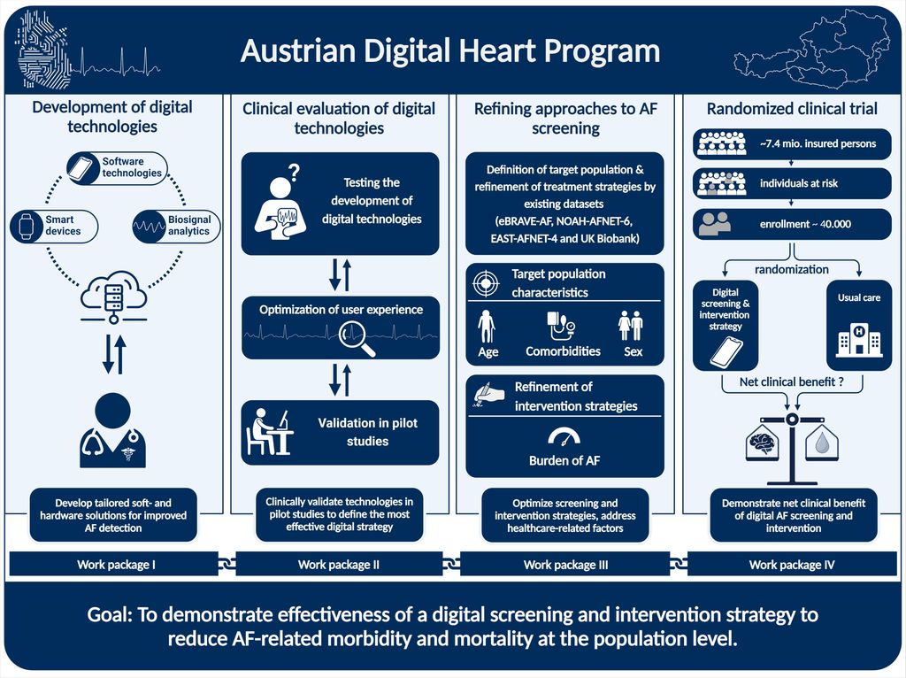 Das Austrian Digital Heart Program entwickelt und evaluiert in einer groß angelegten, randomisierten Studie eine Smartphone-basierte VHF-Screening- und -Management-strategie für die österreichische Bevölkerung.
