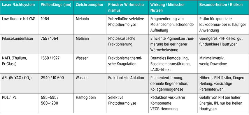 Laser- und Lichtsysteme wirken beim Melasma adjuvant, indem sie vorhandenes Pigment in Epidermis und Dermis reduzieren. Sie ersetzen jedoch nicht die Basistherapie, welche die Melaninsynthese hemmt. Laserbehandlungen sind nur im Rahmen eines multimodalen Gesamtkonzepts sinnvoll und ersetzen keine photoprotektiven oder topischen Massnahmen. Ihr Einsatz erfordert präzise Kenntnis der Pathophysiologie, um Nebenwirkungen wie PIH oder Hypopigmentierungen zu vermeiden (Tab.1).1,27